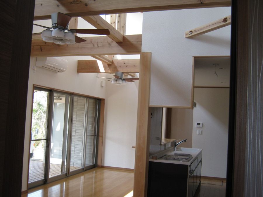 | 住宅の特徴等 | 住宅1階にダイニングキッチン、洋室、子供部屋、仏間付の和室等を配して、2階は7平方メートルのロフトのみであり、高い天井と大きな吹き抜け空間があり、白壁により明るさが増している。現わしの木材とのコントラストにより目に安らぎを与えている。 |